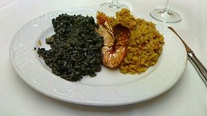 シーフードのパエリアとイカ墨のパエリア