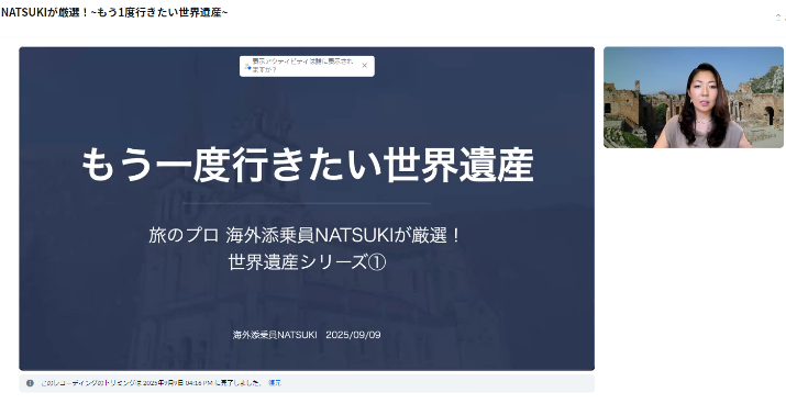 NATSUKIさんは日本遺産ソムリエの資格をお持ちで日本遺産普及協会アドバイザーも務められていますので、世界の魅力だけでなく日本の魅力もご案内し、実際に訪れるきっかけになっていただけるような講座を今後も企画していきたいと思います。