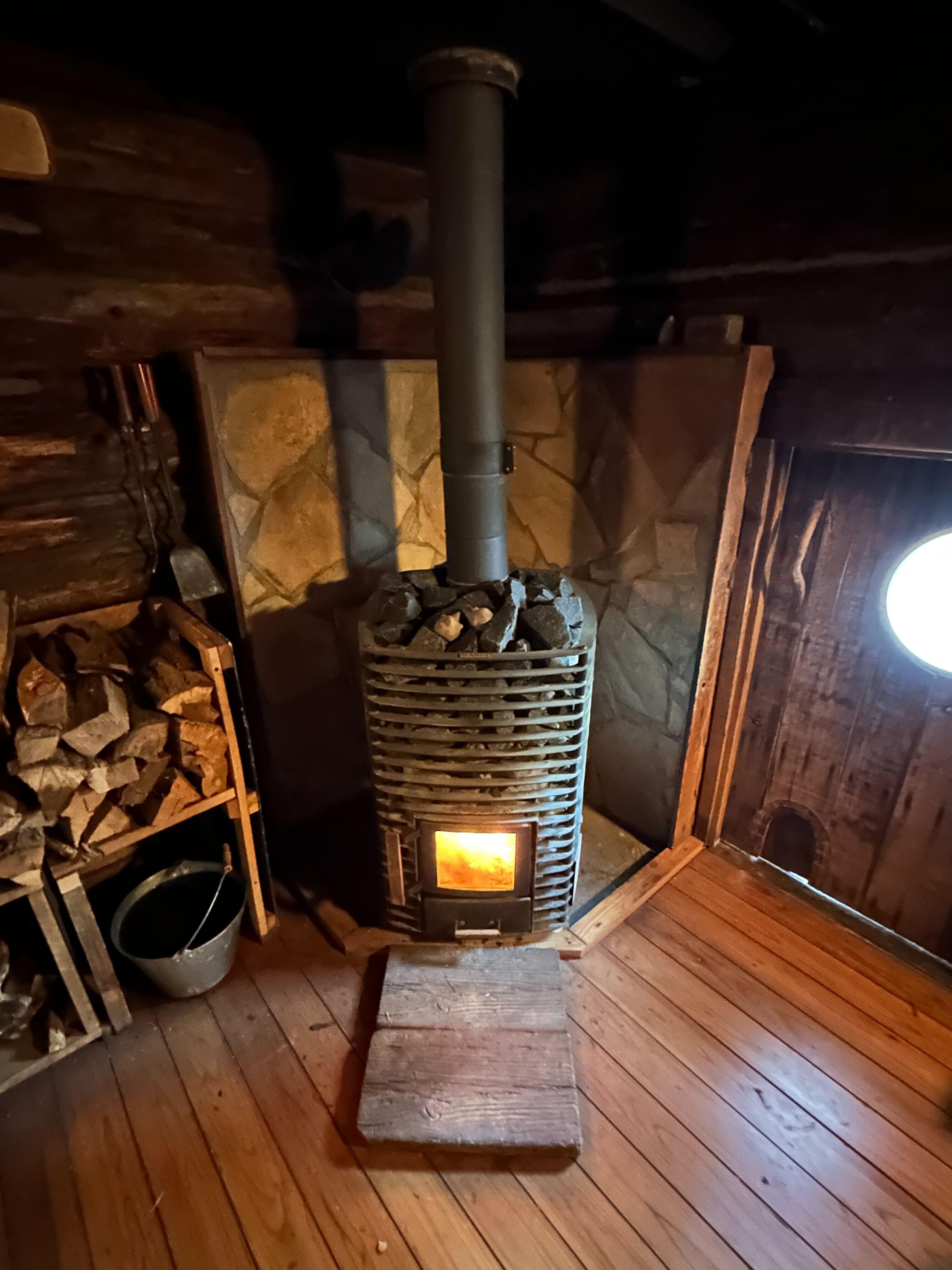 サウナ小屋のドアを開けると大きなストーブがあり、そこには薪がゴウゴウと燃えています。