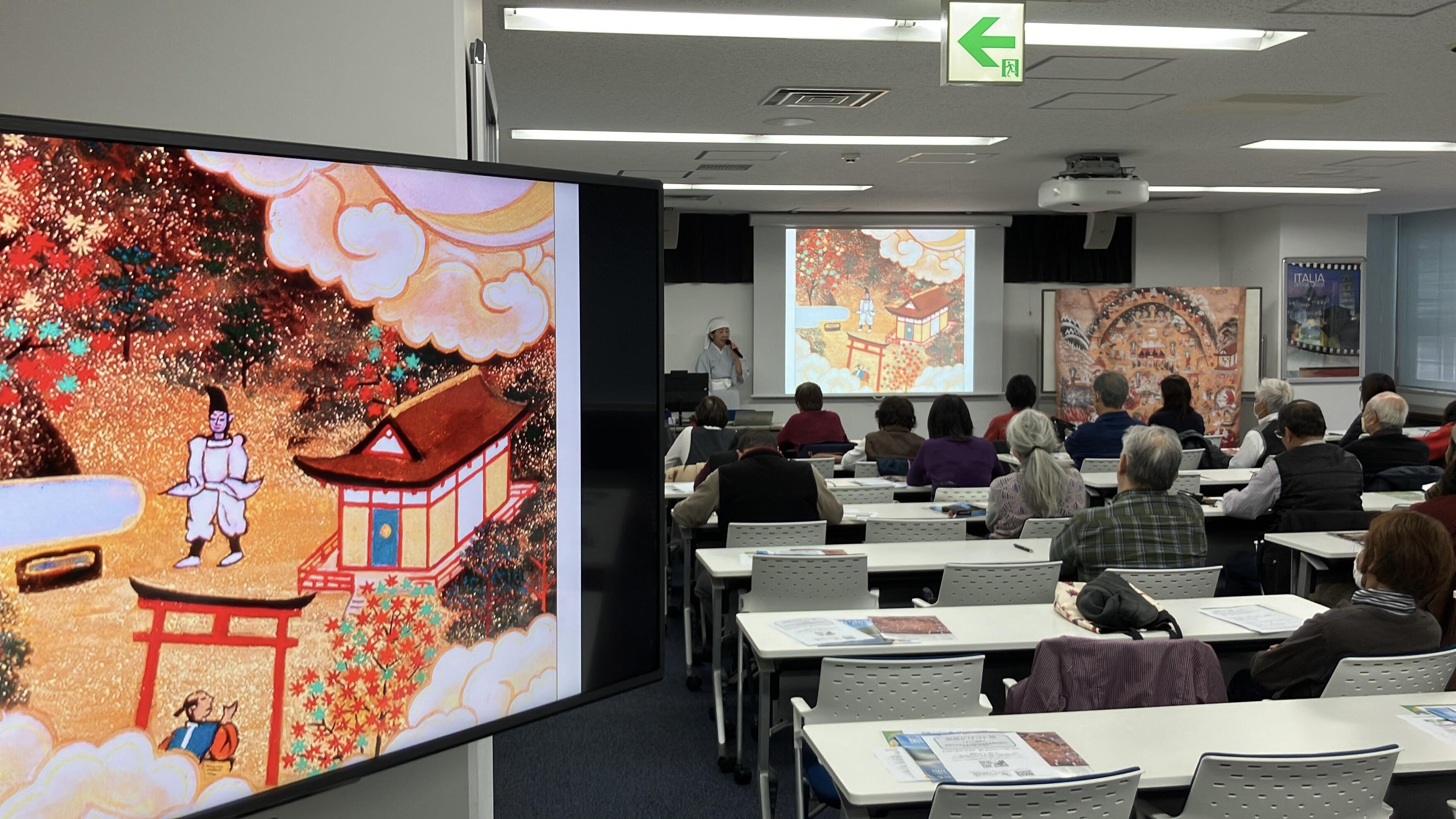 今回の講座では、新宮市観光協会の登録ガイド「西浦康代さん」をお招きし、熊野信仰を伝道してきた熊野比丘尼に扮し、絵解きの実演をしながら、熊野の歴史をご紹介いただきました。