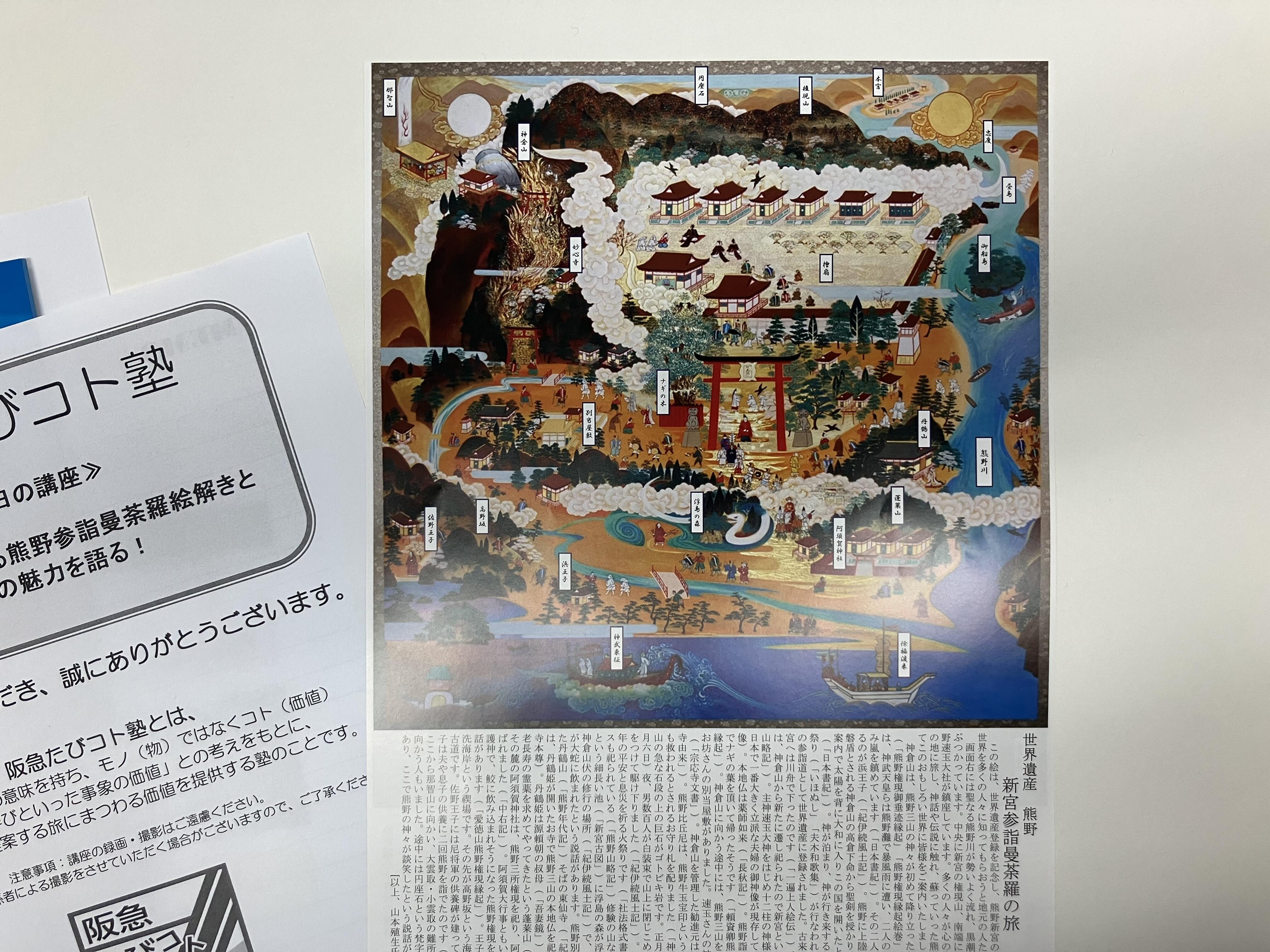 熊野信仰に基づく仏教の曼荼羅で、熊野三山(熊野本宮大社、熊野速玉大社、熊野那智大社)を中心に描かれています。物語の背景や登場人物の感情が、絵を通じて鮮やかに伝わり、まるでその場にいるかのような臨場感を味わうことができました!