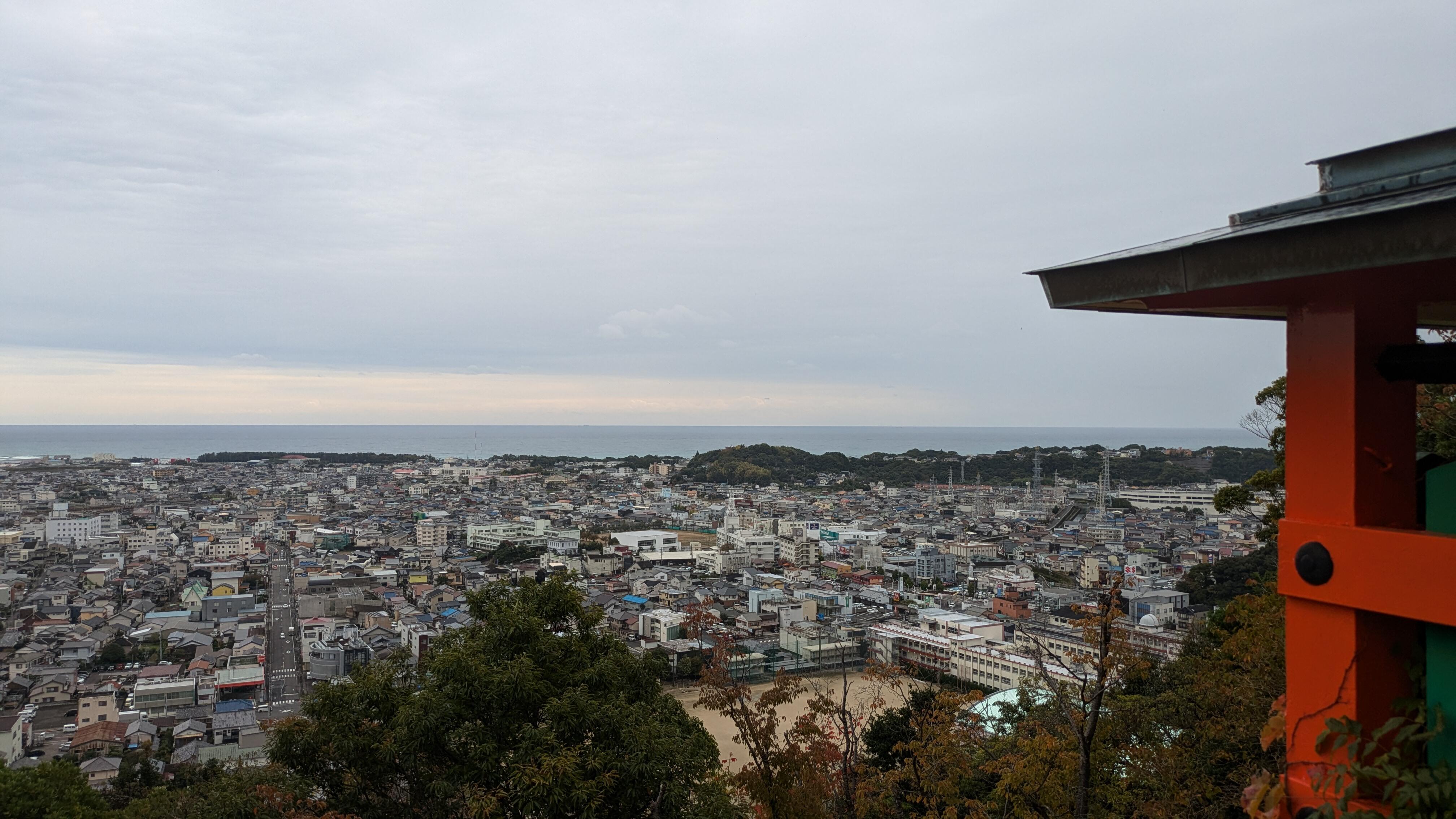 権現山の中腹に鎮座し、熊野三山に祀られる熊野権現が初めて地上に降臨した伝承をもつ古社です。天ノ磐盾(あまのいわたて)という険しい崖の上にあり、熊野古道の一部である五百数十段の急峻な石段を登ったところにご神体のゴトビキ岩があります。そこから眺める市街地と熊野灘の遥々とした眺めは、新宮市随一のビュースポットです。